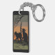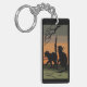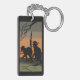 Dieses Bild zeigt 2 schwarze Katzen mit leuchtenden Augen, die auf einem Grasstreifen unter einem Zweig eines toten Baumes stehend sind. Der Himmel hinten ist orange und hellschwarz. Ein schwarzer Rahmen wurde hinzugefügt. Diese Schlüsselketten sind in verschiedenen Stilen und Größen erhältlich.