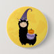 Niedliches schwarzes Lamm in einem lila Hexenhut, der einen Jack o'lantern trägt. Vollgelber Mond im Hintergrund und eine Fledermaus.