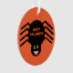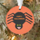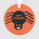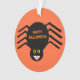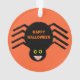 Dieses phantastische Acryl-Ornament besticht durch eine schwarze Spinne mit acht haarigen Beinen, gelben Augen mit großen schwarzen Pupillen und einem offenen Mund, der seine Reißzähne zeigt. Es gibt einen orangefarbenen Text, der "Happy Halloween" und einen passenden orangefarbenen Hintergrund lautet.