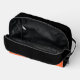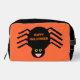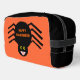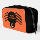 Dieser phantastische Halloween-Kosmetikbeutel besticht durch eine spitzige, schwarze Spinne mit acht haarigen Beinen, gelbe Augen mit großen schwarzen Pupillen und einen offenen Mund, der seine Reißzähne zeigt. Es gibt einen orangefarbenen Text, der "Happy Halloween" und einen passenden orangefarbenen Hintergrund lautet.