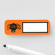 Dieses phantastische Dry Ease Namensschild weist eine spukhafte schwarze Spinne mit acht haarigen Beinen, gelben Augen mit großen schwarzen Schülern und einen offenen Mund auf, der seine Reißzähne zeigt. Es gibt einen orangefarbenen Text, der "Happy Halloween" und einen passenden orangefarbenen Hintergrund lautet.
