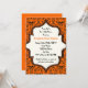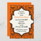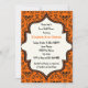 Skulls Damask orange schwarzes Muster Halloween Hochzeit Braudusche Einladung. Dieses formale, elegante Design besticht durch ein Damast-Blumenmuster und Schädelmuster sowie durch einen Elfenbeinrahmen in der Mitte. Klassisches, aber zeitgemäßes Design mit zwei Schriftart: einem Vintagen und einem coolen. Elegantes, sprichwörtliches Design, perfekt für gotische oder Halloween-Hochzeiten im Herbst.
