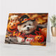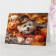 Halloween Karte mit Maltipoo Hund. Ein niedlicher flauschiger Hund Maltipoo in einem Halloween-Kostüm in einem stimmungsvollen Herbstsaal, mit der Aufschrift Halloween kommt. Dieses Geschenk inspiriere deinem Hundefreund Maltipoo. Es wird auch eine festliche Stimmung zu Ihrem Freund bringen.