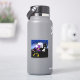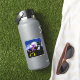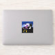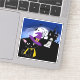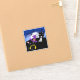 schwarze Katze mit einem lila Hexenhut mit gelber Band. Die Katze sitzt vor einem spukhaften Haus auf einem Hügel mit Vollmond im Hintergrund. Das Haus ist schwarz mit einem lila Dach und einer Fledermaus, die darüber fliegt. Der Hintergrund ist dunkelblau mit Sternen und Vollmond. Das Bild befindet sich auf einem weißen Hintergrund.