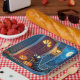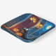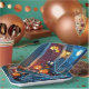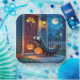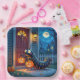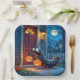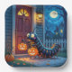 Ein großer, Cartoon-ähnlicher Zentipede hält Jack-o'-Laternen, während er nachts vor einer roten Tür in einem Vorstadtviertel stehend ist
