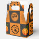 Halloween Schachbrettdesign in Orange und Schwarz mit Jack-o-Laternen, Hexe, Vollmond mit Fledermäusen und Spinnennetz mit einer gruseligen Spinne. Ich wünsche Euch ein tolles Halloween!