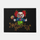 Die Türmatte, die mit einem schwarzen Hintergrund gezeigt werden und ein Halloween-Clown drucken.