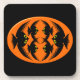 Dieser phantastische Korkkork-Untersetzer ist in einem Oval in Orange mit sechs Krähen gehalten. Jede Krähe hat gelbe Augen mit schwarzen Schülern und ausgestreckten Flügeln. Die Krähen fliegen einander entgegen und bilden eine ovale Form. Der Hintergrund ist schwarz.