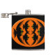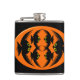 Dieser phantastische Kolben weist ein orangefarbenes Oval mit sechs Krähen auf. Jede Krähe hat gelbe Augen mit schwarzen Schülern und ausgestreckten Flügeln. Die Krähen fliegen einander entgegen und bilden eine ovale Form. Der Hintergrund ist schwarz.