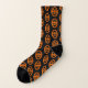 Dieses phantastische Paar gemusterter Socken weist ein orangefarbenes Oval mit sechs Krähen auf. Jede Krähe hat gelbe Augen mit schwarzen Schülern und ausgestreckten Flügeln. Die Krähen fliegen einander entgegen und bilden eine ovale Form. Der Hintergrund ist schwarz.