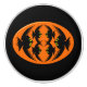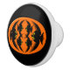 Dieser phantastische Keramik-Drehknopf weist ein orangefarbenes Oval mit sechs Krähen auf. Jede Krähe hat gelbe Augen mit schwarzen Schülern und ausgestreckten Flügeln. Die Krähen fliegen einander entgegen und bilden eine ovale Form. Der Hintergrund ist schwarz.