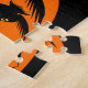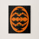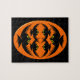 Dieses phantastische Puzzle Halloween-Design hat ein orangefarbenes Oval mit sechs Krähen. Jede Krähe hat gelbe Augen mit schwarzen Schülern und ausgestreckten Flügeln. Die Krähen fliegen einander entgegen und bilden eine ovale Form. Der Hintergrund ist schwarz.
