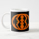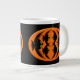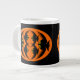 Diese phantastische Tasse ist in einem Oval in Orange mit sechs Krähen gehalten. Jede Krähe hat gelbe Augen mit schwarzen Schülern und ausgestreckten Flügeln. Die Krähen fliegen einander entgegen und bilden eine ovale Form. Der Hintergrund ist schwarz.
