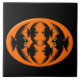 Diese phantastische Kachel weist ein orangefarbenes Oval mit sechs Krähen auf. Jede Krähe hat gelbe Augen mit schwarzen Schülern und ausgestreckten Flügeln. Die Krähen fliegen einander entgegen und bilden eine ovale Form. Der Hintergrund ist schwarz.