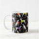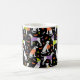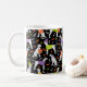 Halloween-Dalmatiner-Hunde mit gepunkteten schwarz-weißen Mänteln halten Trick-oder-Leckerei-Kürbis, tragen Hexenhüte und Pullover mit verstreuten Fledermäusen, Pfoten und Hundeknochen.