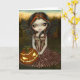 Eine schwermütige Halloween-Malerei - ich habe diese winged Schönheit an der Dämmerung gemalt - dort ist eine rauchige Dämmerung in der Luft, da die ungesehene Sonne einstellt. Die bloßen Bäume geben einen Geschmack des Schauers in der Luft. Es gibt einen großen reizenden Jack O'lantern auch und boshaft grinst im Schoss ihres durchdachten gestreiften Kleides. Meine eigene ursprüngliche Acrylmalerei.
