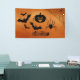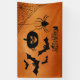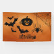 Halloween-Design mit schwarzem bösen Kürbis, Fledermäusen und Spinne über einem orangefarbenen Hintergrund