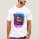 A unique and modern Halloween design. An adorable alien with a witch hat and magic wand shares the scene with a cute cat peeking out of a pumpkin. The design is framed by neon lines, giving it a futuristic and mystical feel.