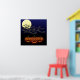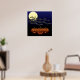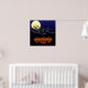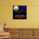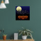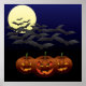 Drei Halloween Laternen mit fliegenden Fledermäusen auf dunklem Mondlicht.
