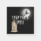 Weiße Tropfkerzen auf schwarzem Hintergrund mit einer Hexe, die auf Vollmond mit Fledermäusen fliegt. Die Hintergrundfarbe kann geändert werden.