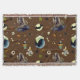 Wasserfarbene Halloween-Elemente wie Schädel, Knochen, Fledermäuse, Kessel und Bonbons auf dunkelbraunem Hintergrund.