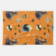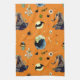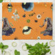 Wasserfarbene Halloween-Elemente wie Schädel, Knochen, Fledermäuse, Kessel und Bonbons auf orangefarbenem Hintergrund.