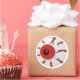 Ein Augenbindekleber für Halloween, rote Adern und Iris, die nach rechts schauen.