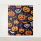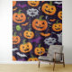 Diese Grafik zeigt einen lebendigen Wandteppich, der das fröhliche Halloween-Fest darstellt und Elemente wie tanzende Skelette und schelhafte schwarze Katzen enthält.
