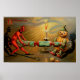 Ein wunderschönes Vintage Poster mit einem Teufel und einem Kürbischarakter, der versucht, einen Kürbis zu öffnen.