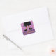 Diese lustigen Halloween-Aufkleber sind mit einem Hexenkleid mit Beinen in orangefarbenen und schwarz gestreiften Strümpfen und ihren spitzen schwarzen Schuhen mit orangefarbenen Schnallen ausgestattet. Hintergrund ist ein lila Kreismuster. Im folgenden Text steht: "Happy Halloween!" Originelle Kunst von Anne Coffey.