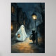 Halloween-Szene mit einem Gespenst- und Katzentreffen auf der Straße