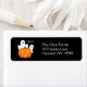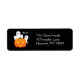 Rücksendeadressen-Aufkleber zu Halloween mit einer originellen Grafik von zwei Geistern hinter einem beleuchteten Kürbiskürbis Sprichwort BOO! auf schwarzem Hintergrund.
