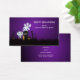 Eine lustige Visitenkartenvorlage mit einem halbwegs freundlichen Gruß. Creepy niedliche Halbwahndesign. Set in einem dunklen und beängstigenden Friedhof. Ein Grabstein sagt RIP, mit einer Kerze und ein paar leuchtenden Schädeln auf dem Boden. Ein alter, cremiger Zaun lehnt sich zur Seite ab. Ein bezauberndes, lächelndes Skelett winkt und einige cool aussehende Geister schwingen in der Luft herum. Set auf schwarzem und lila Farbverlauf.