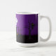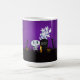 Eine lustige Kaffeemaschine-Tasse mit einem gruseligen niedlichen Halloween-Design. Set in einem dunklen und beängstigenden Friedhof. Ein Grabstein sagt RIP, mit einer Kerze und ein paar leuchtenden Schädeln auf dem Boden. Ein alter, cremiger Zaun lehnt sich zur Seite ab. Ein bezauberndes, lächelndes Skelett winkt und einige cool aussehende Geister schwingen in der Luft herum. Eine Eule sitzt mit leuchtenden Augen im Baum, und ein gemäßigter Mond ist zur Seite abgesperrt, und in der Nähe fliegen Fledermäuse. Set auf einem lila Verlauf.
