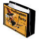 Illustration einer Tasche aus Halloween-Party, mit einem Cartoon, der auf einem Broomstick reitet. Sie ist in einem schwarzen Hexenhut mit roten Streifen, einem schwarzen Kleid und rot-weiß gestreiften Socken gekleidet. Sie hält eine glühende Jack-o'-Laterne in einer Hand. Der Hintergrund ist orange mit dem Wort "Halloween".