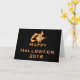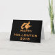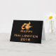 Das ist ein beängstigendes Happy Halloween schwarze Hintergrundekarte mit orangefarbener Fliegerhexe und seinem Besen. Es ist eine lustige Halloween-Karte. Dies ist personalisierte, kundenspezifische Vintag Happy Halloween Grußkarte.