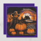 A spooky scarecrow stands guard in a foggy pumpkin patch, its ragged hat casting a shadow over its eyes. In the distance, a house vanishes into black birds soar against a fiery orange sunset. This vintage-inspired design captures the essence of Halloween with its eerie atmosphere and classic imagery.