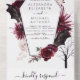 Halloween 31. Oktober Herbst Herbst Dunkle Wasserfarbe Burgund und Schwarze Hochzeitseinladungen - beinhaltet eine beängstigende, elegante Schriftzeichen-Typografie mit modernen Blume, Spiders, Koblis und Bat Wings für die besondere Creepy Wedding Day Feier.