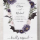 Halloween 31. Oktober Herbst Herbst Dunkle Wasserfarbe Lila und Grüne Hochzeitseinladungen auf schwarzem Hintergrund - beinhaltet eine beängstigende und elegante Schriftzeichen-Typografie mit modernen Blume und Bat Wings für die besondere Creepy Wedding Day Feier.