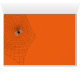 Spooky, schwarze Halloween Hexe auf einem Besenstiel Set vor einem orangefarbenen Hintergrund. Spaß Grußkarte, mit einer beängstigenden Überraschung im Inneren, um Freunden & Familie während der Trick oder Treat Feiertage Ihre gruseligen Wünsche zu äußern.