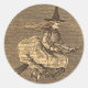Auf diesem Aufkleber befindet sich ein Lithograph aus dem 19. Jahrhundert, der auf einem Besen sitzt.