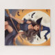 Jigsaw Puzzle einer fröhlichen, jungen Hexe mit langfließendem Haar, die vor einem großen, glühenden Vollmond auf einem Broomstick reitet. Fledermäuse fliegen um sie herum und tragen so zur bezaubernden Nachtszene bei.