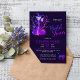 Trendy Halloween lila Pflaumentypografie Brautparty Party Einladung Vorlage mit einer Hexe in einem neonfarbenen lila und rosa Kleid und Hut mit Besen, Bürstenholz und Katzen.+++ Einfach mit Ihren Details personalisieren. ++++++++++ Die Einladung eignet sich für ein chic Halloween-Brautparty zum Thema Hexe.
