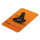 Happy Halloween Illustration mit einem Hexenhut mit goldenen Sternen und Mond und einer hängenden Spinne auf einem orangefarbenen Hintergrund mit Jack-o-Laternen Musterformen.
