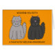 Zwei Cartoon flauschige Kätzchen mit Reißzähnen, eine schwarz und eine grau. Das Bild hat einen orangefarbenen Hintergrund und wird von den Worten "Wünscht euch beide einen fangtastischen Hochzeitstag" begleitet.
