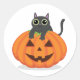 Ein niedlicher Halloween-Aufkleber mit einer schwarzen Katze auf einer Kürbislaterne.