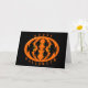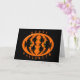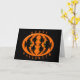 Diese gespenstische Halloween-Grußkarte kennzeichnet ein orange Oval mit sechs Krähen in ihr. Jede Krähe hat gelbe Augen mit schwarzen Schülern und ausgestreckten Flügeln. Die Krähen fliegen in Richtung zu einander eine ovale Form bildend. Der Hintergrund ist schwarz. Die Wörter "glückliches Halloween" werden um die Außenseite des Ovals eingewickelt. Das Innere der Karte ist Schwarzes, also können Sie Ihren eigenen gespenstischen Text oder handgeschriebenen Gruß addieren.