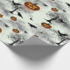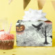 Ein lebhaftes Halloween-Design mit einem leuchtenden Kürbis mit hellen Augen und Zähnen in einer dunklen Landschaft mit Bäumen und Raben.