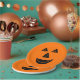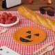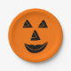 Das wunderliche geschnitzte orange Kürbisgesicht auf dieser Platte ist zu Halloween-Nacht bereit.