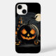 Ein schändliches Schloss vor dem Hintergrund von Echos und der Nachthimmel mit Fledermäusen. Halloween schwarzer Kürbis betont das Thema des Urlaubs.